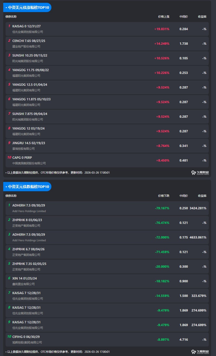 3月25日,中资美元债涨跌幅榜TOP10如下: