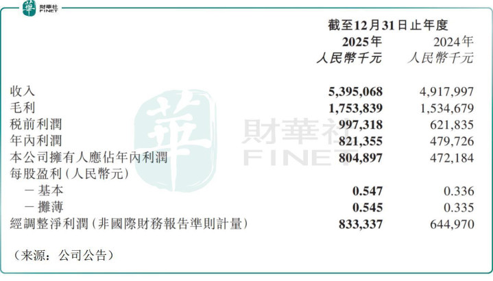 财报数据显示,2025年茶百道实现营收、利润双丰收,全年营收53.95亿元(人民币,下同),同比增长9.7%;归母净利润8.05亿元,同比大幅增长70.5%;经调整净利润8.33亿元,同比增长29.2%,在存量竞争加剧的茶饮市场中,交出了一份稳健且高质量的成绩单。